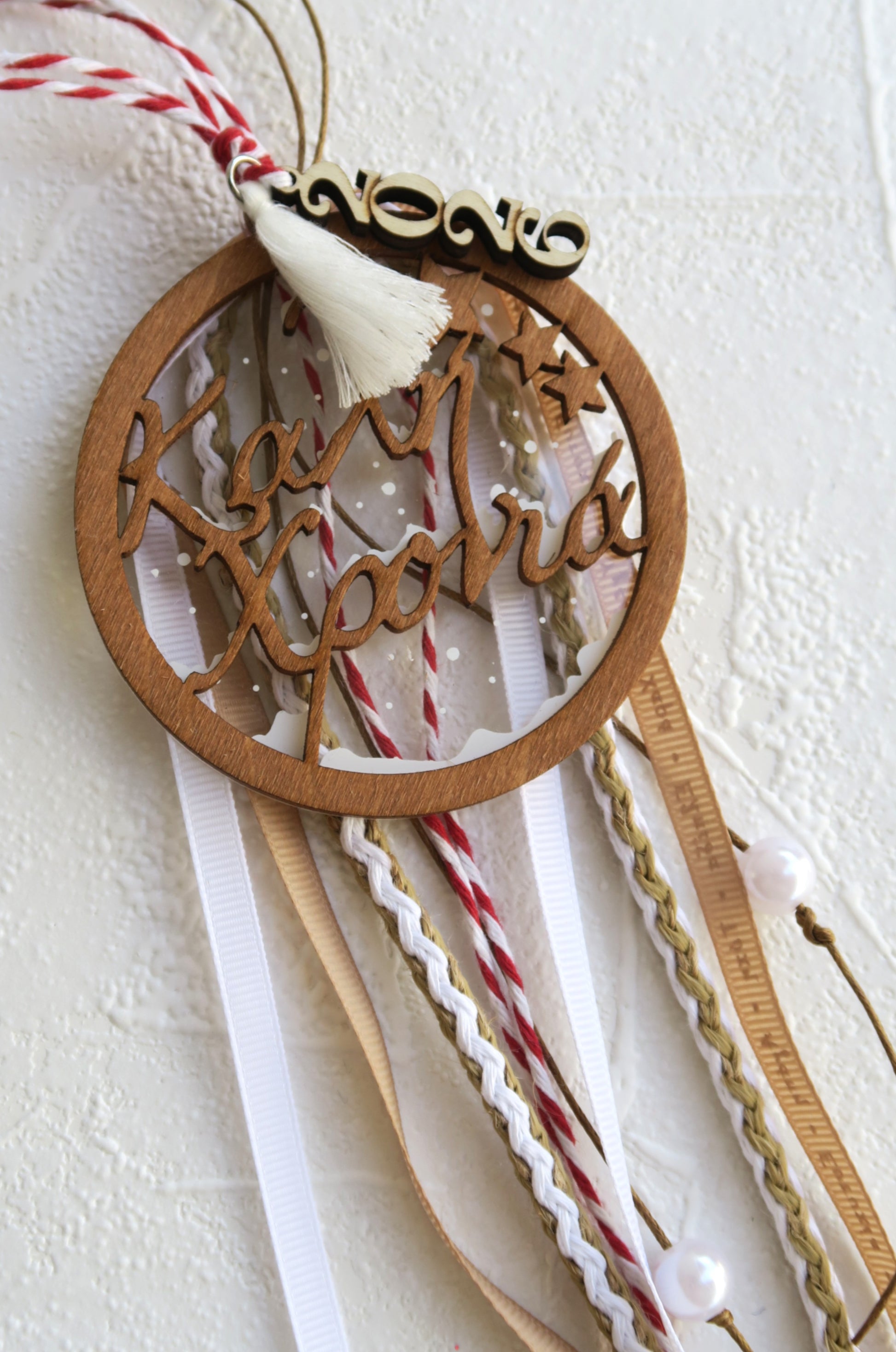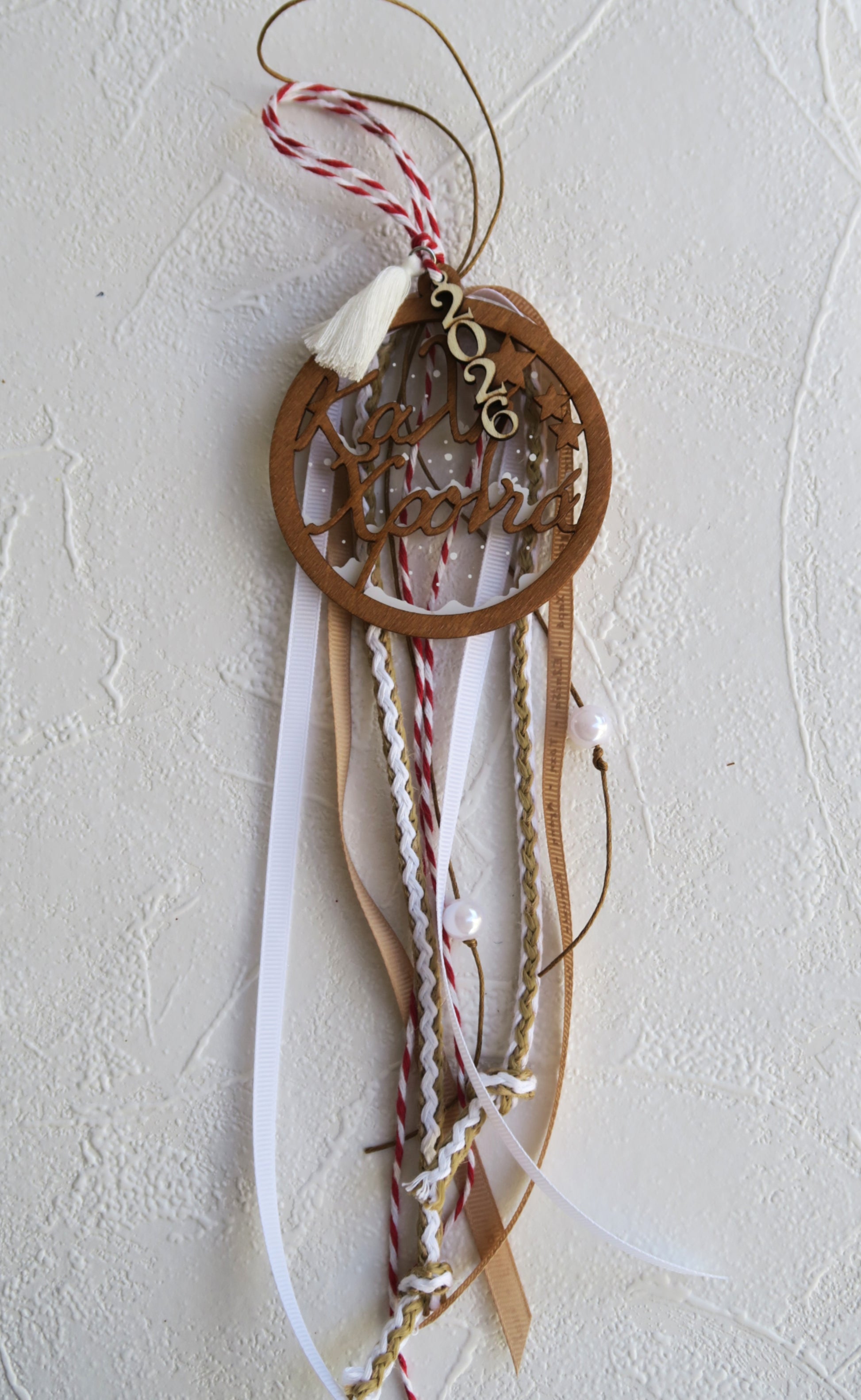 Γούρι από plexi-glass και ξύλο με ευχή.