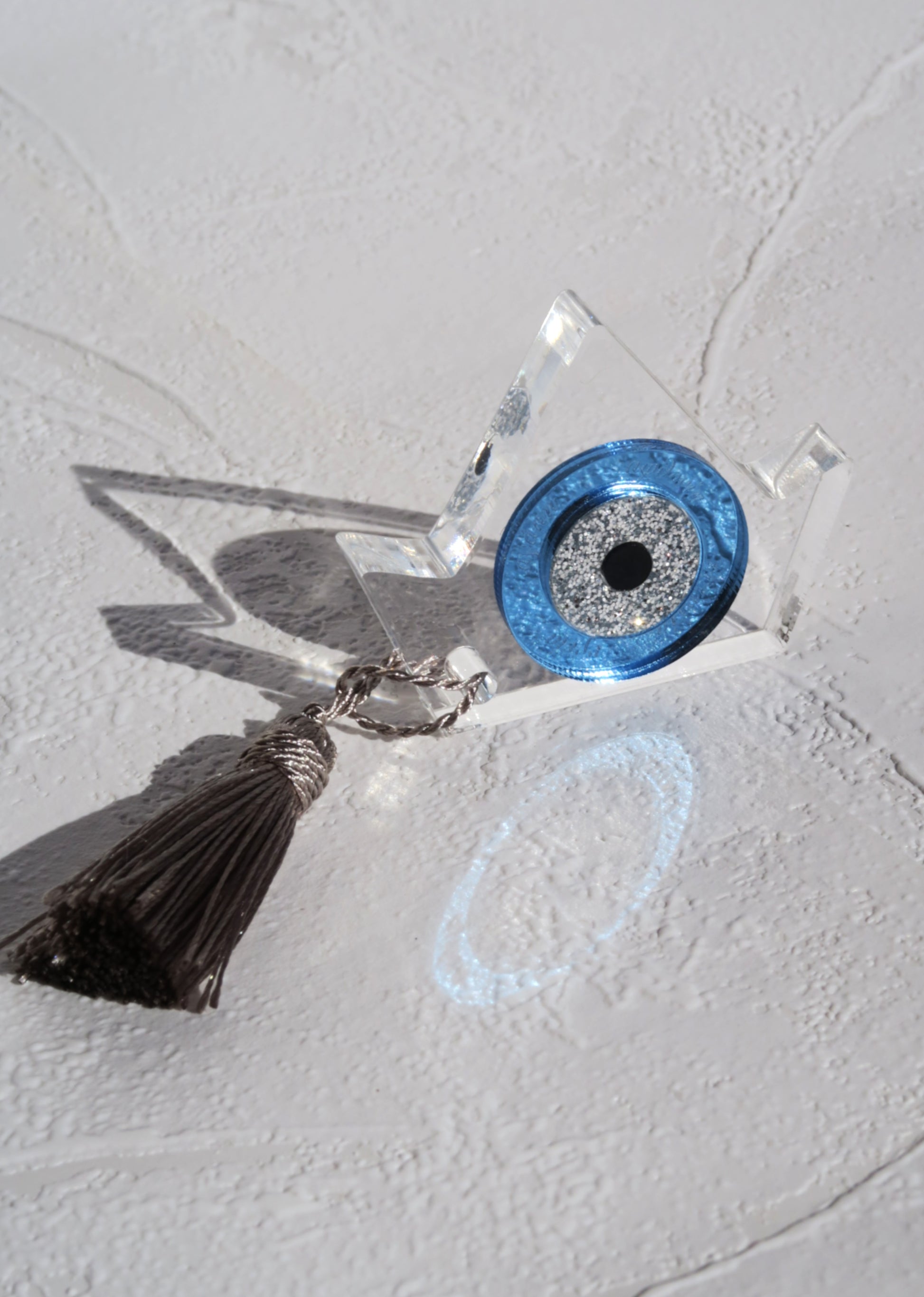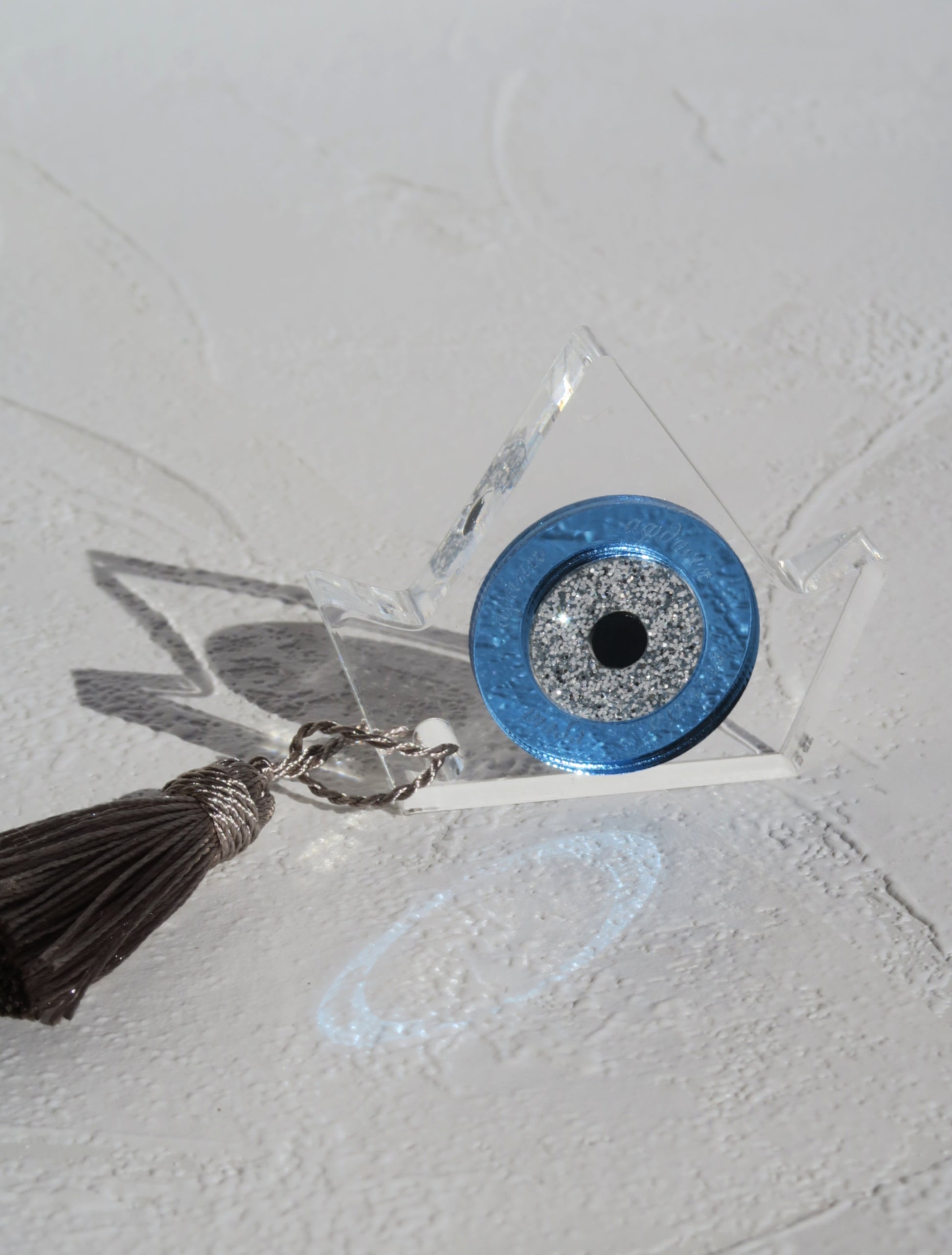 Μικρό καραβάκι από plexi glass με γαλάζιο και ασημί μάτι.
