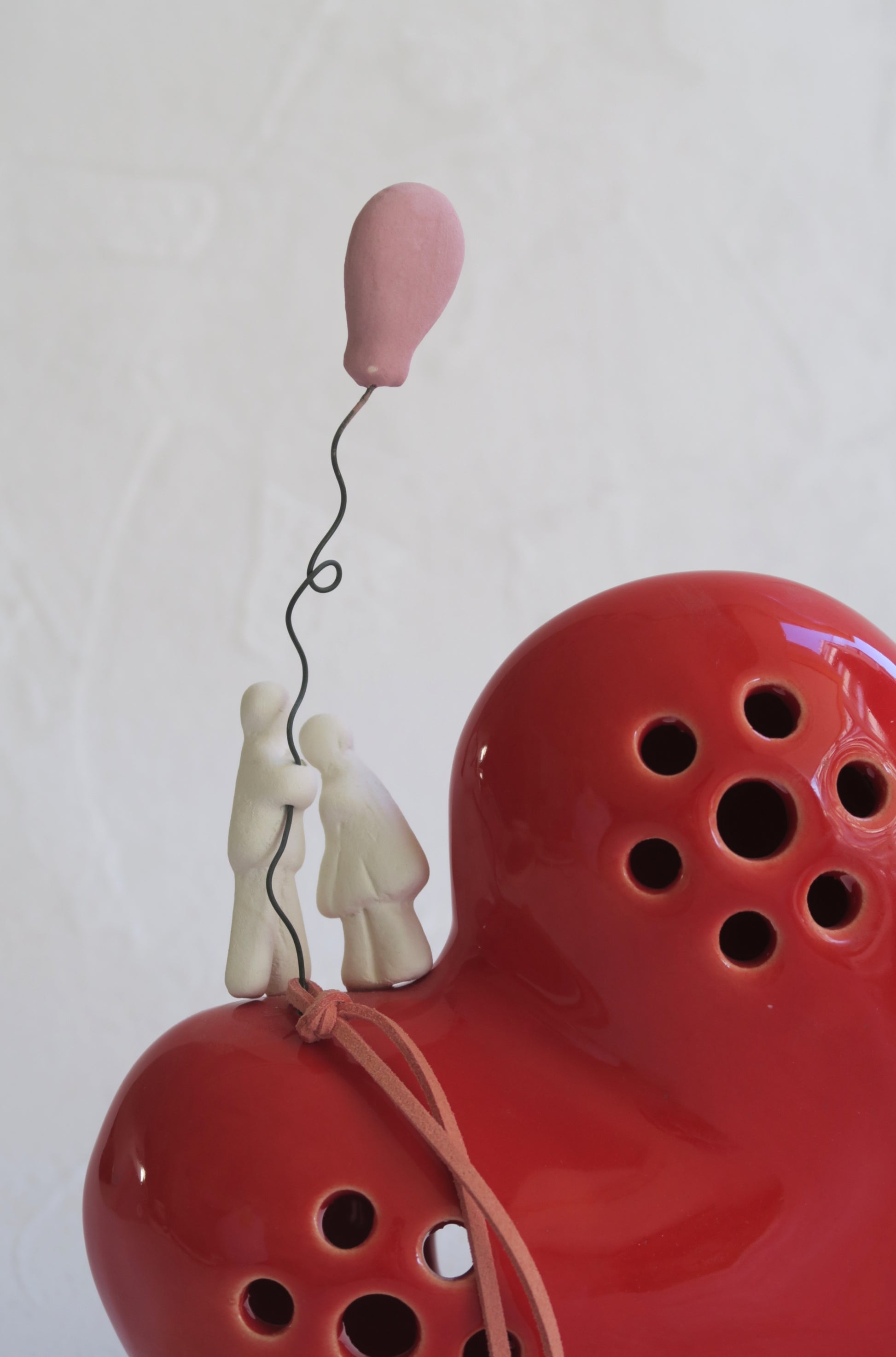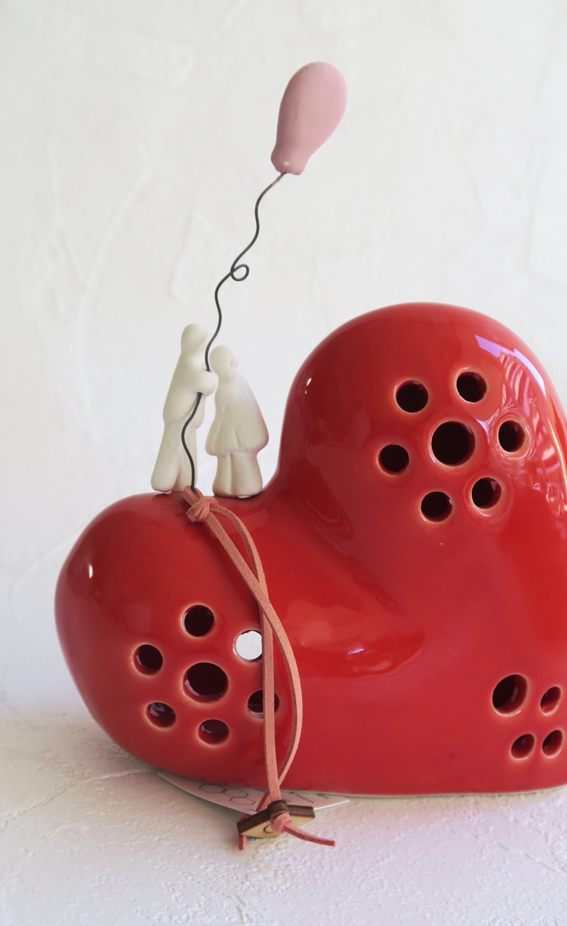 Μεγάλη κεραμική καρδιά σε κόκκινη γυαλιστερή απόχρωση με κεραμικό λευκό ζευγάρι και ροζ ματ μπαλονάκι.