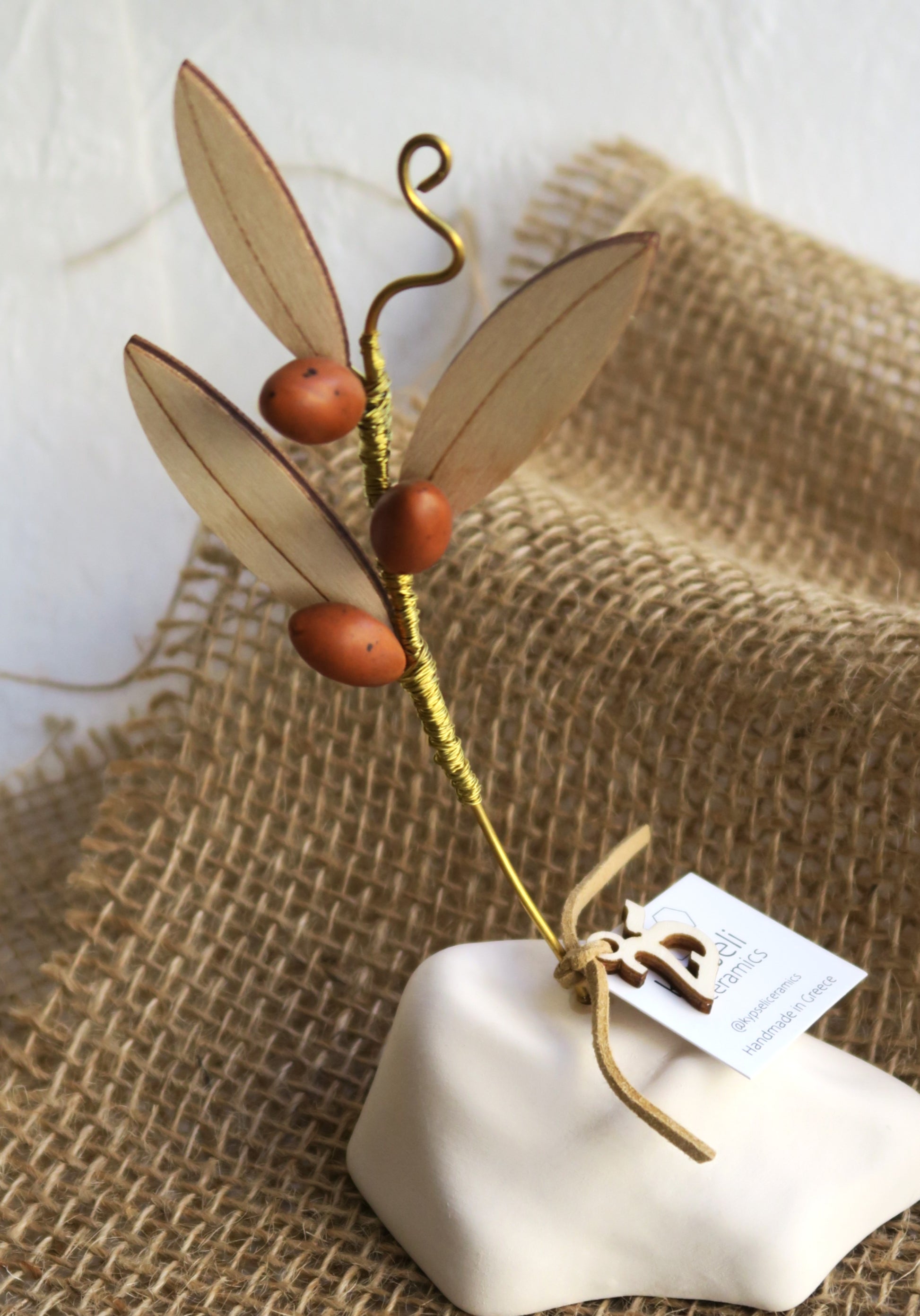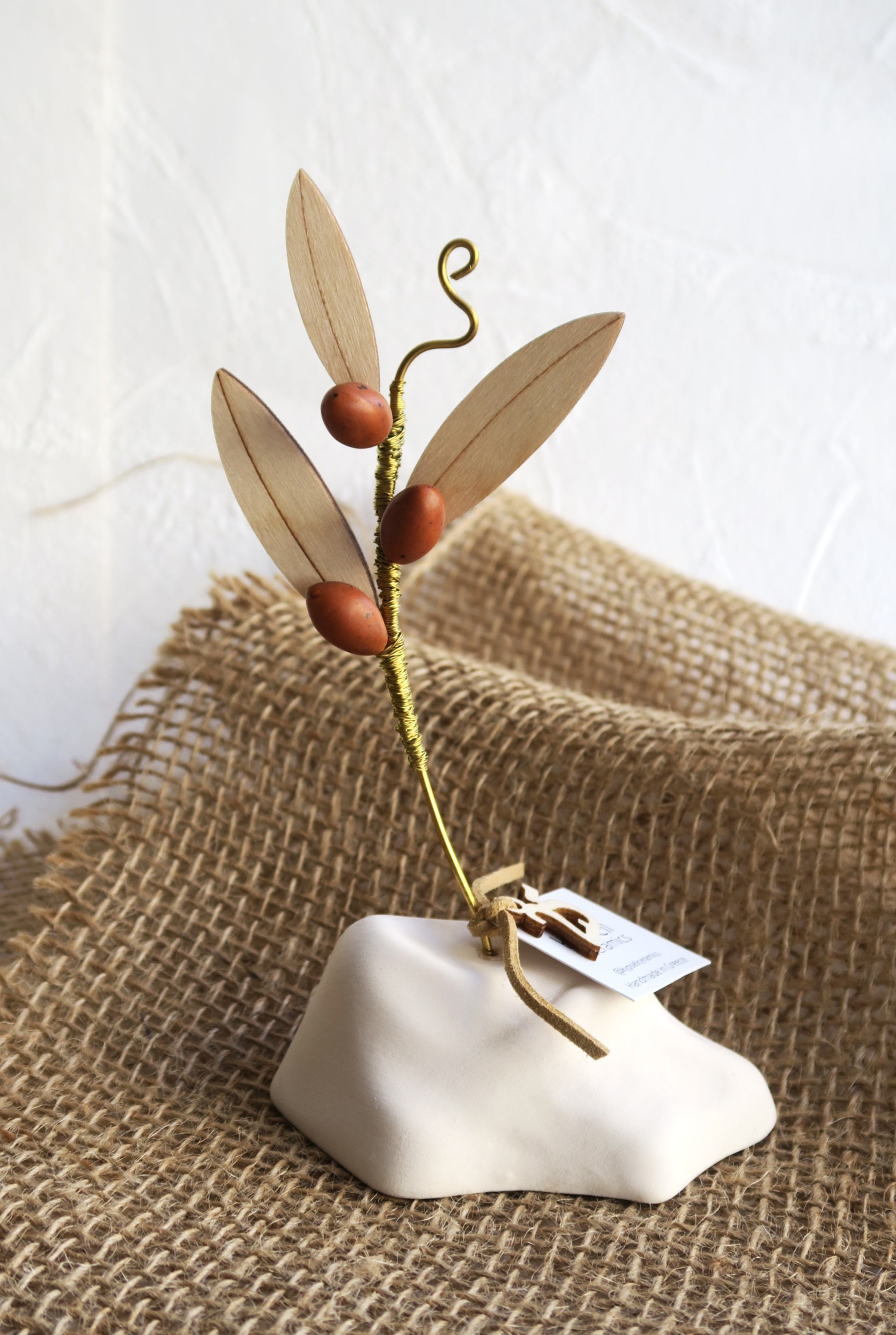 Διακοσμητικό, κλαδί ελιάς σε κεραμική βάση, με φύλλα από ξύλο και μεταλλικές λεπτομέρειες.
