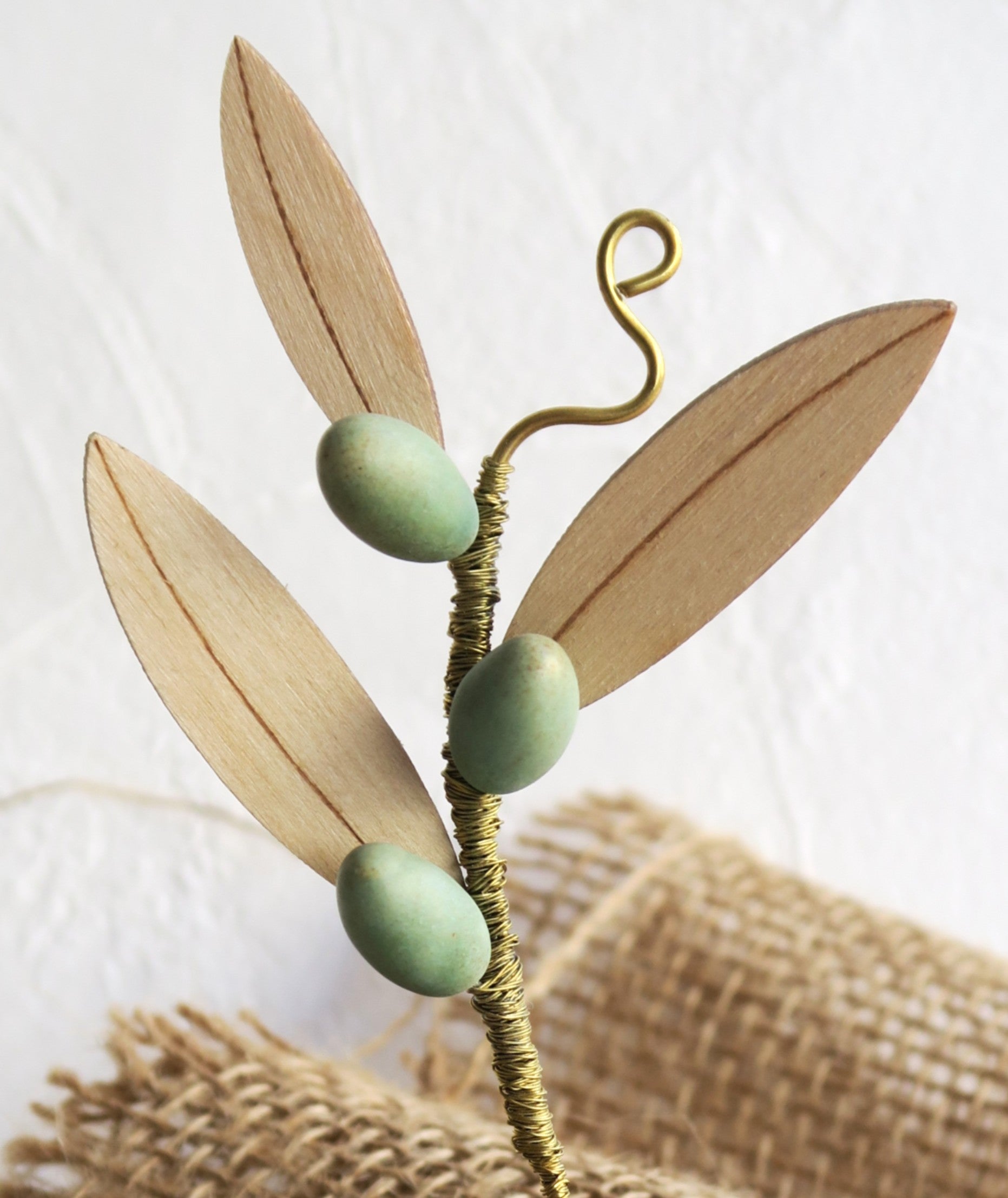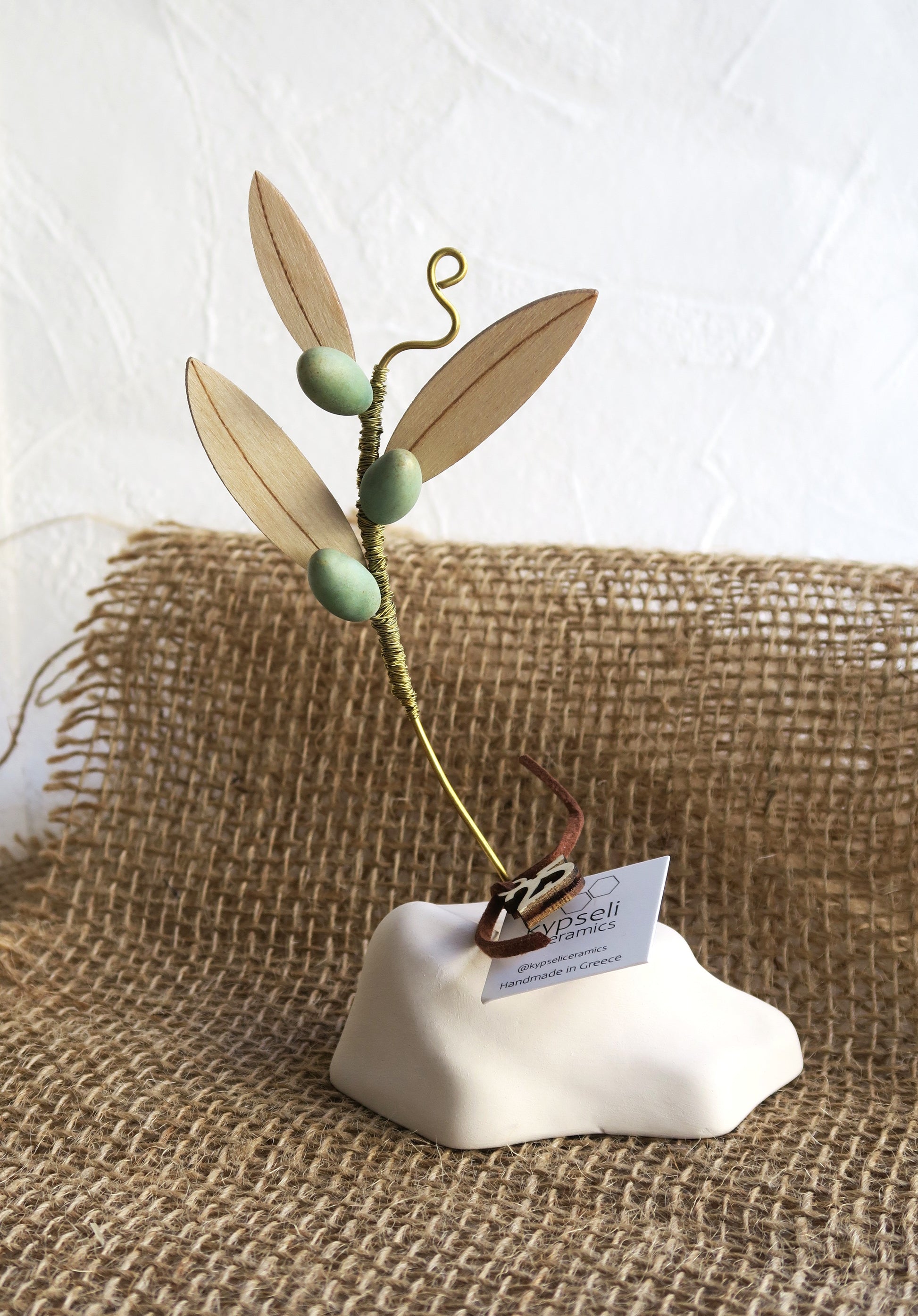 Διακοσμητικό, κλαδί ελιάς σε κεραμική βάση, με φύλλα από ξύλο και μεταλλικές λεπτομέρειες.