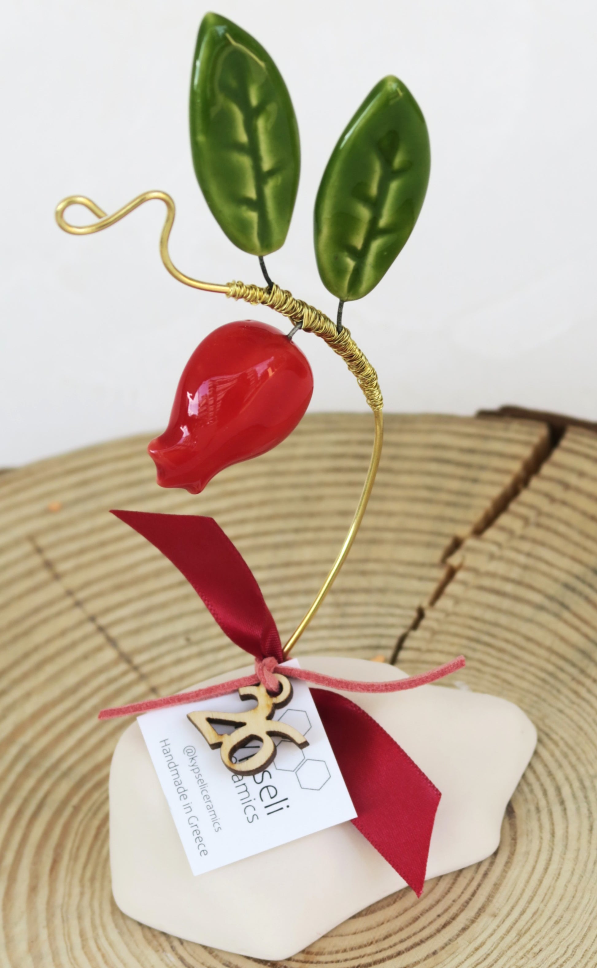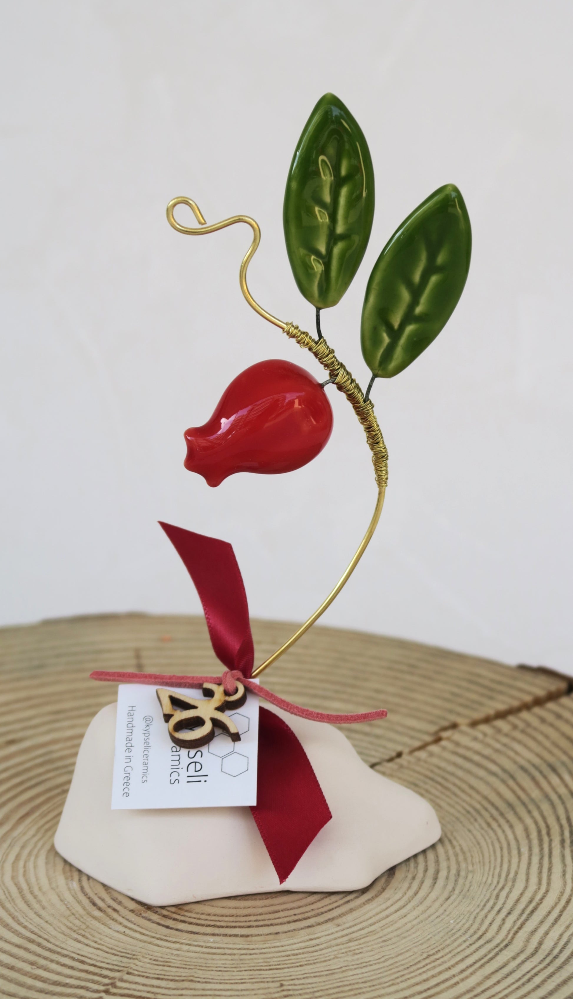 Κεραμικό κλαδί ροδιάς, με κεραμικά φύλλα και κεραμικό ρόδι σε κόκκινη απόχρωση.