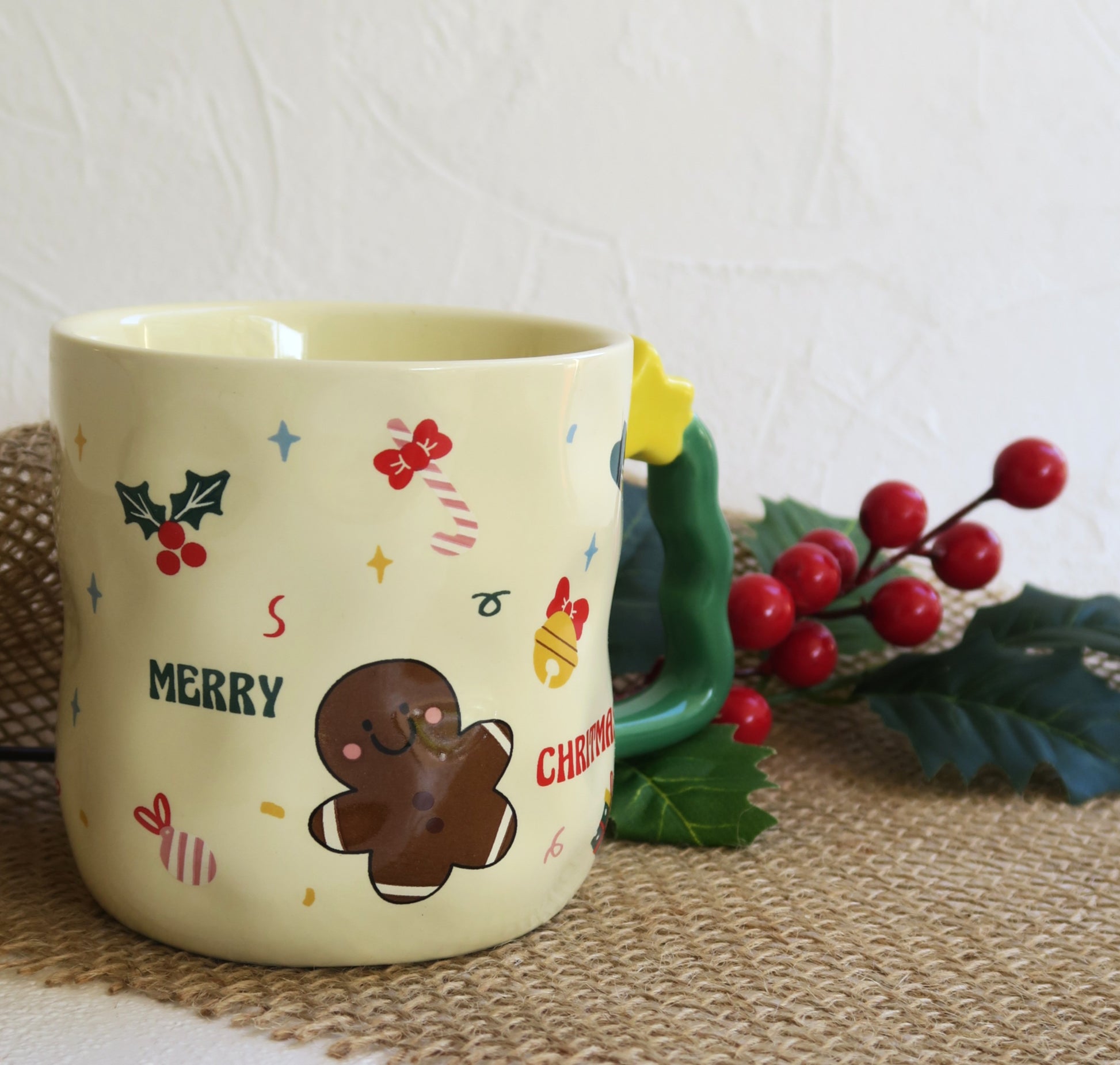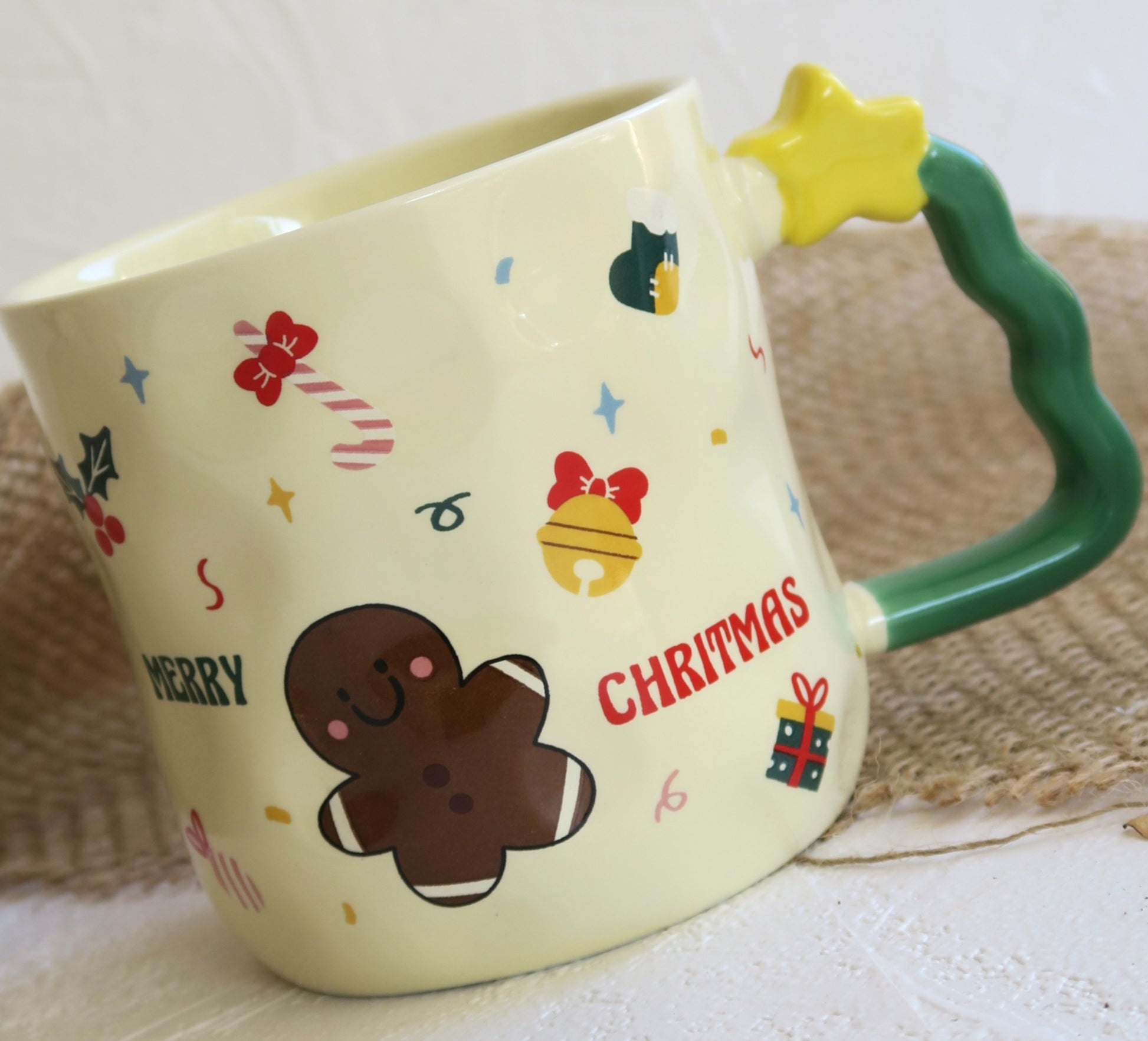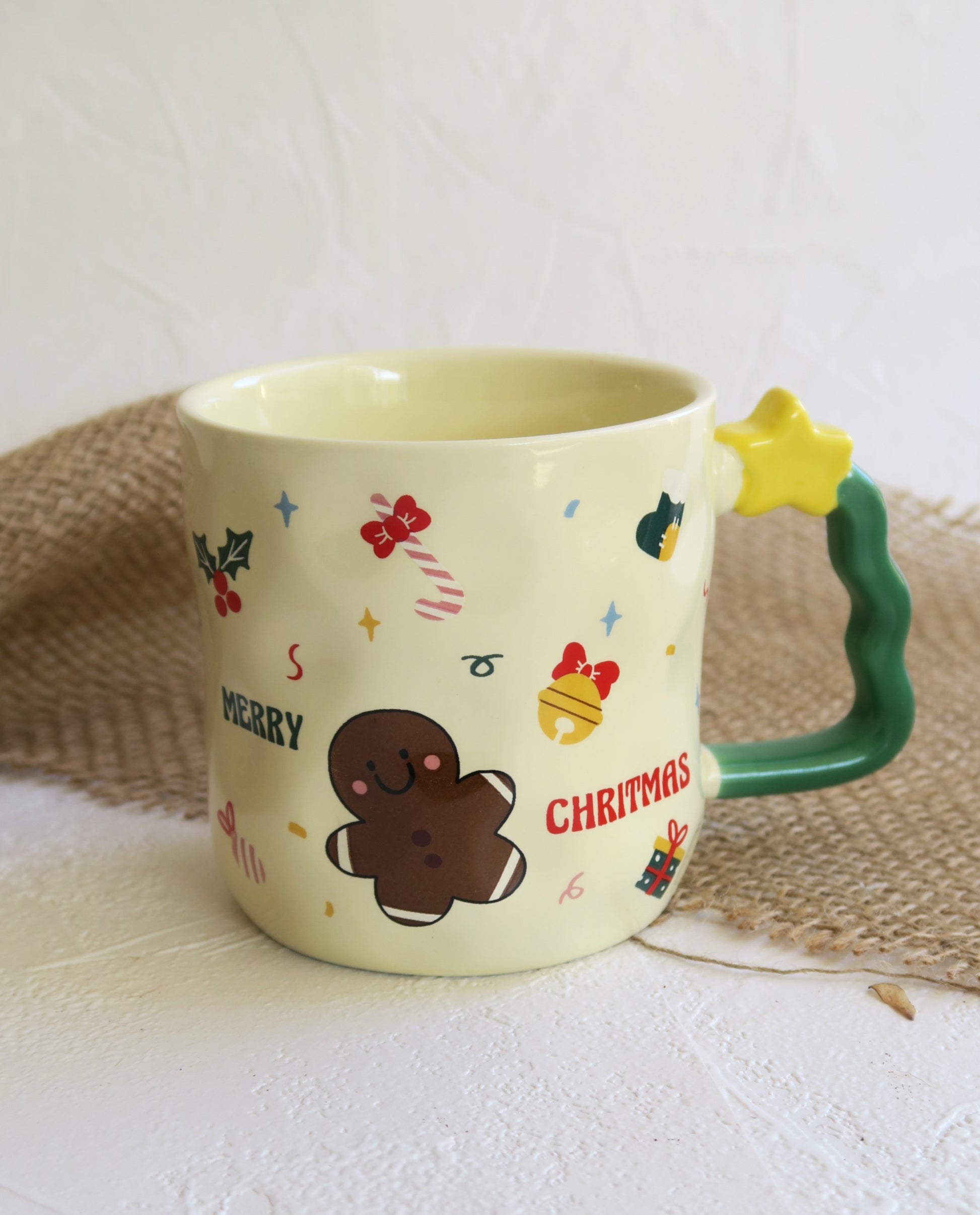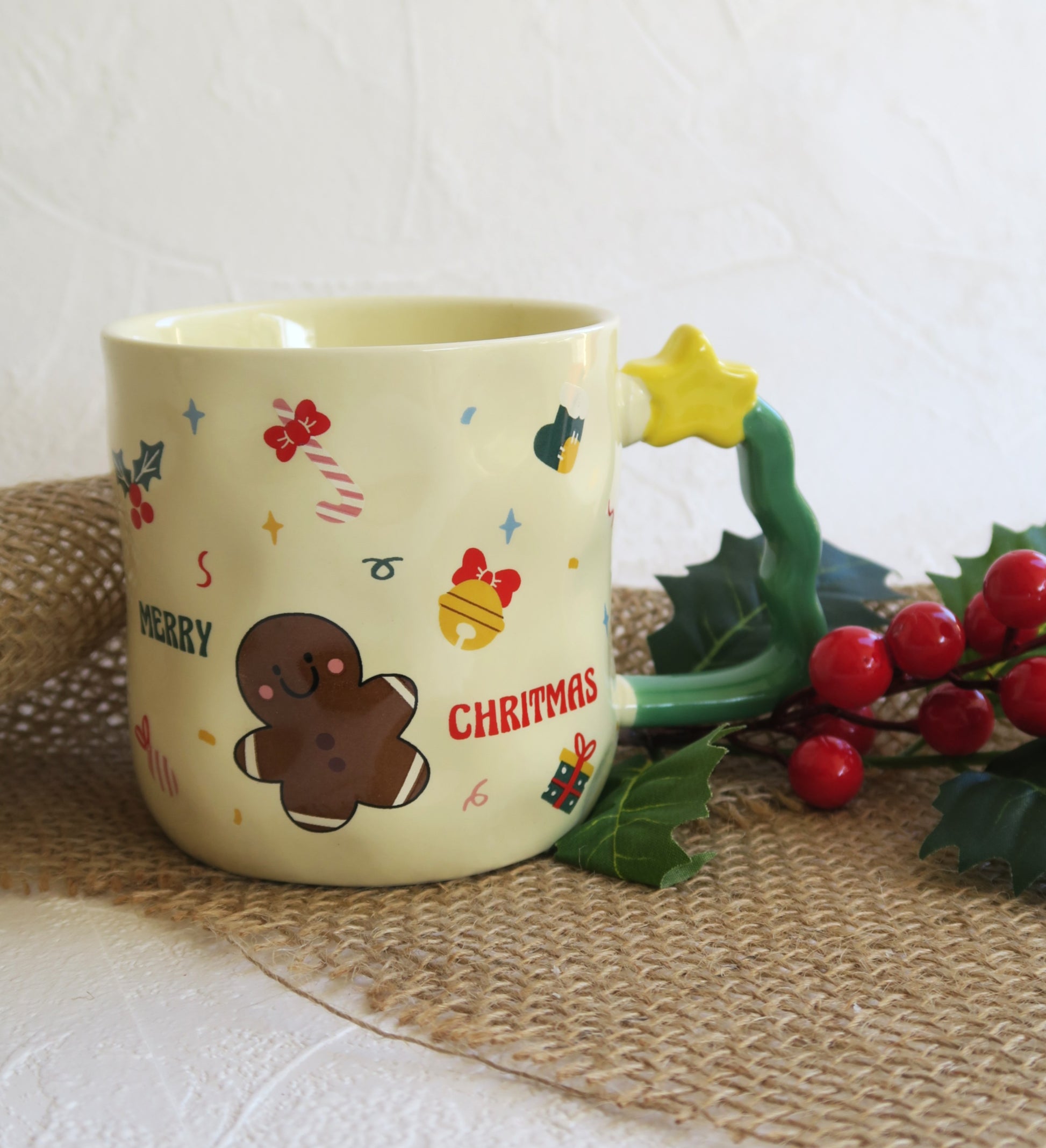 Χριστουγεννιάτικη κούπα με χαρούμενα σχέδια και αστέρι στη λαβή.