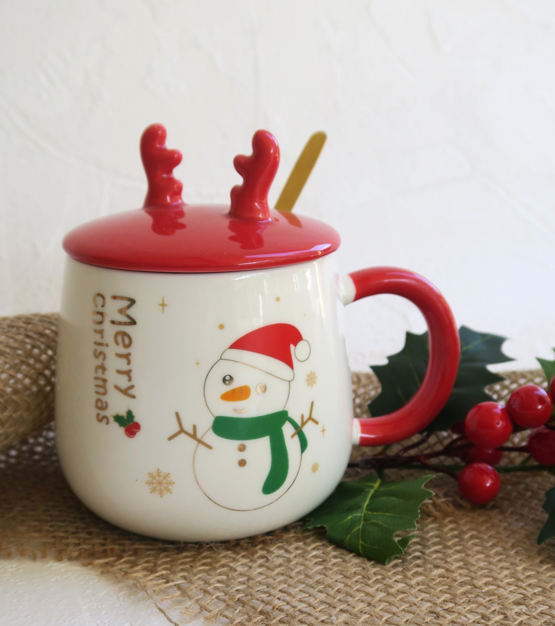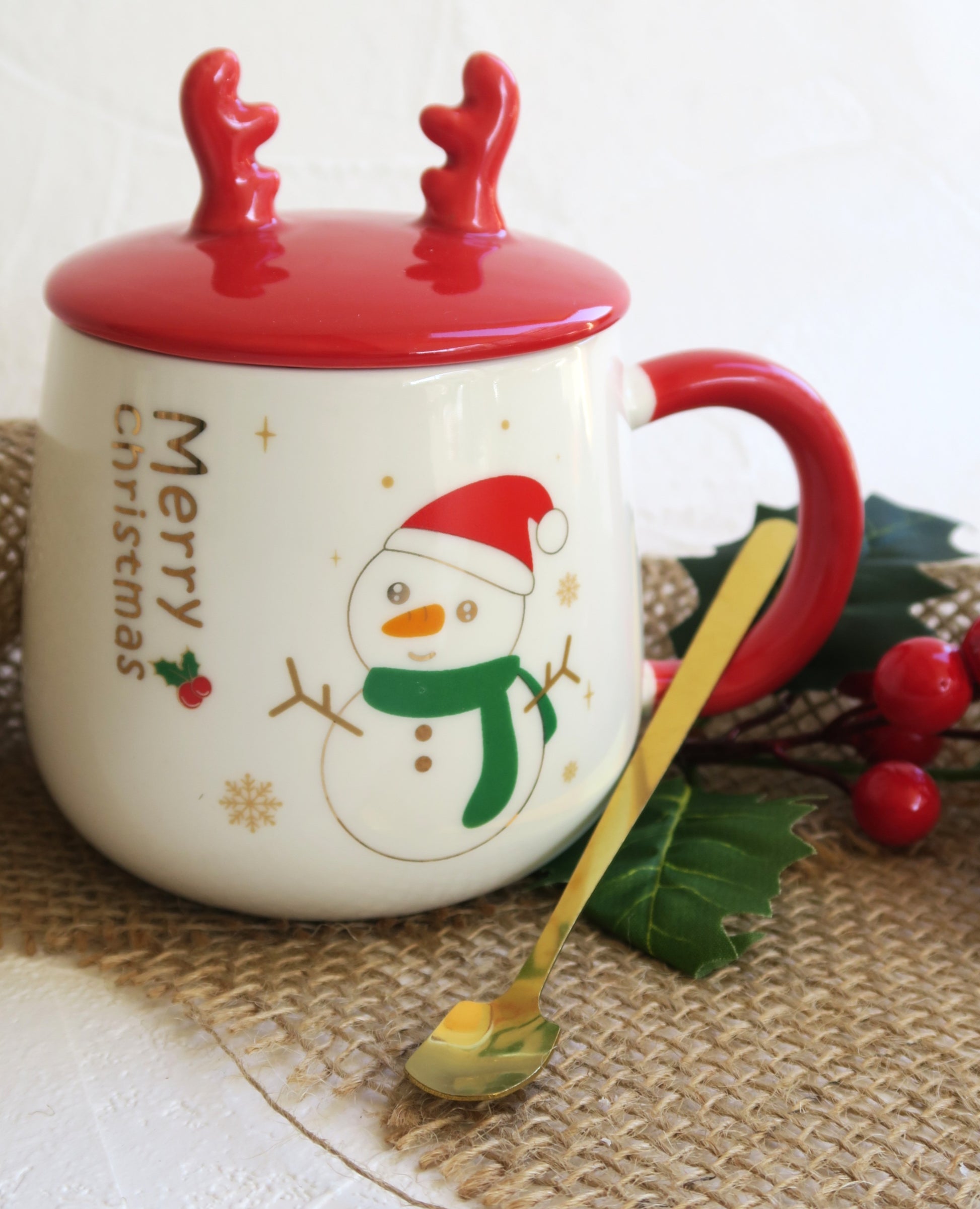 Χριστουγεννιάτικη κούπα με χαρούμενα σχέδια, καπάκι κόκκινο με κερατάκια τάρανδου και κουταλάκι.