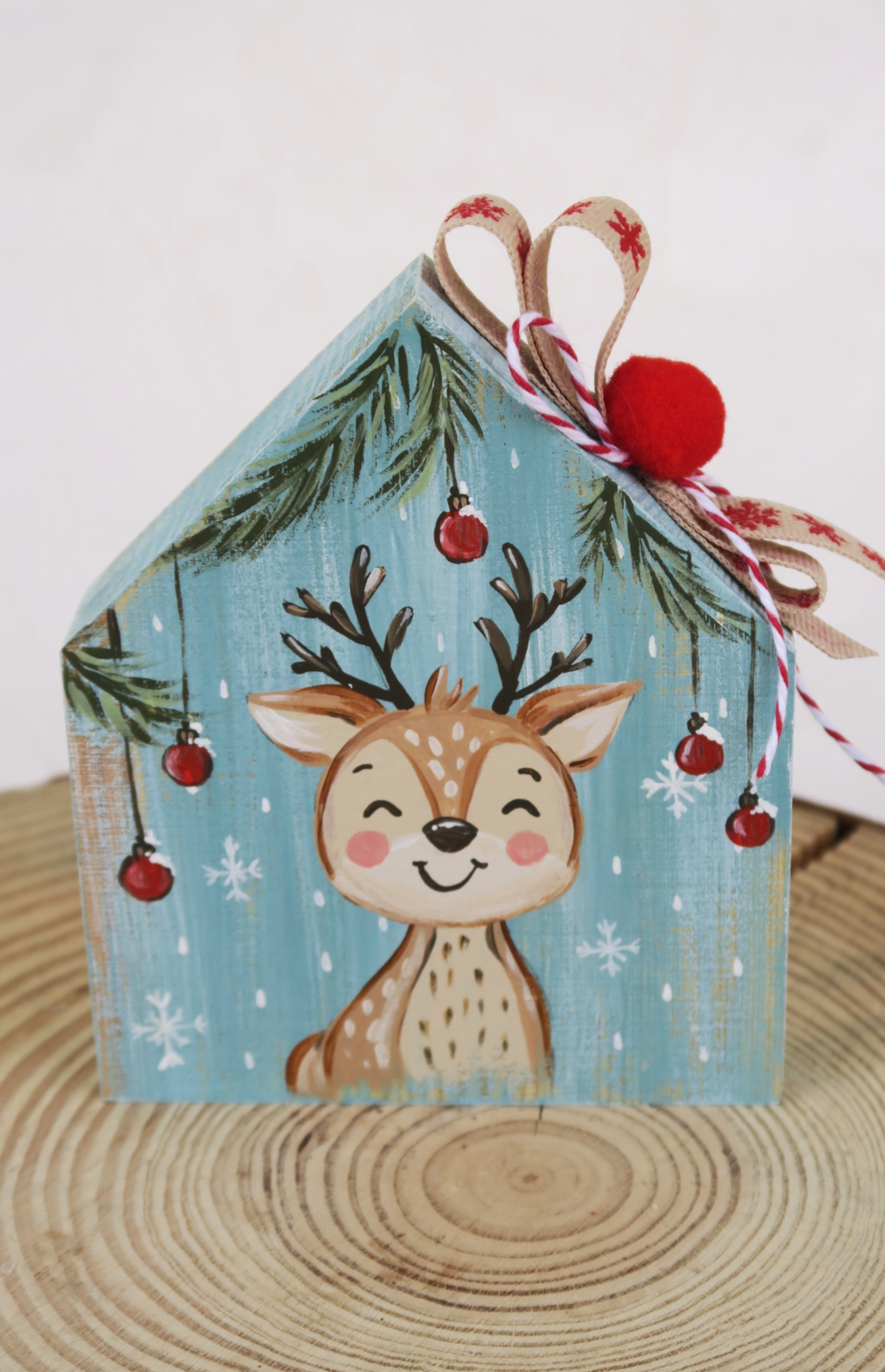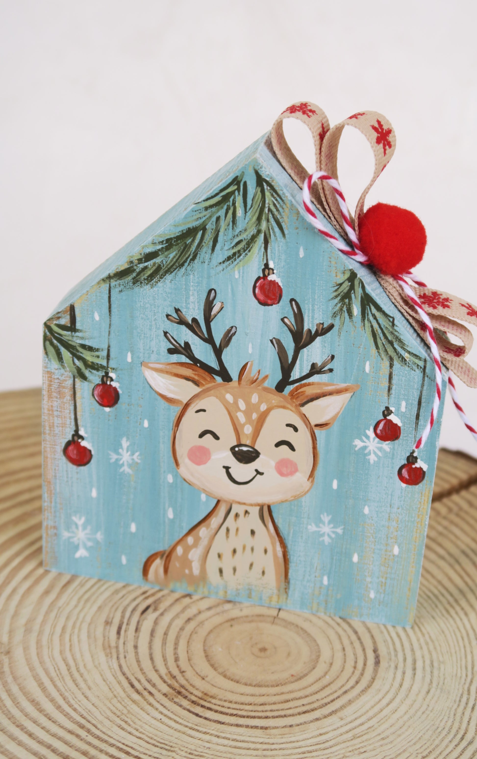 Ξύλινο σπιτάκι ζωγραφισμένο στο χέρι, με χριστουγεννιάτικο χαρούμενο ελαφάκι!