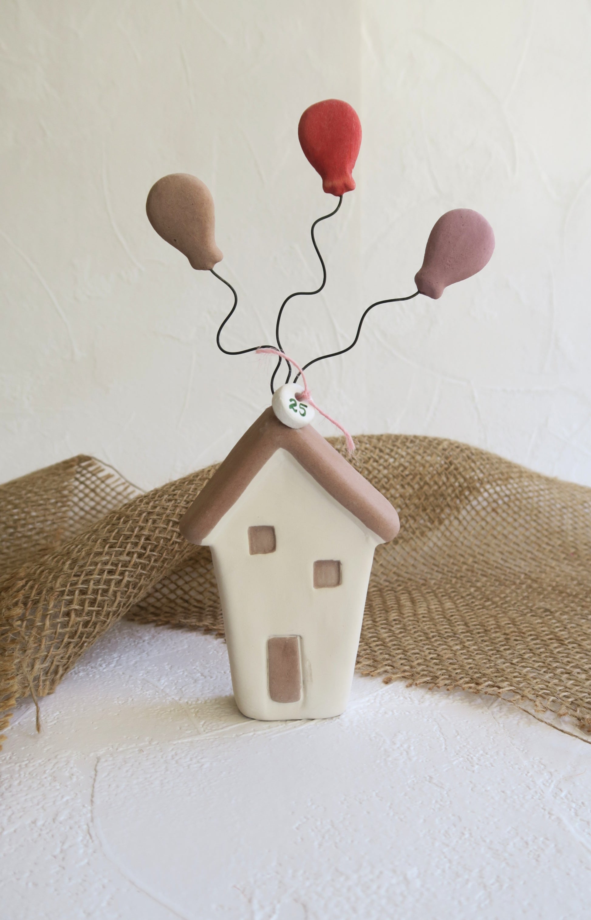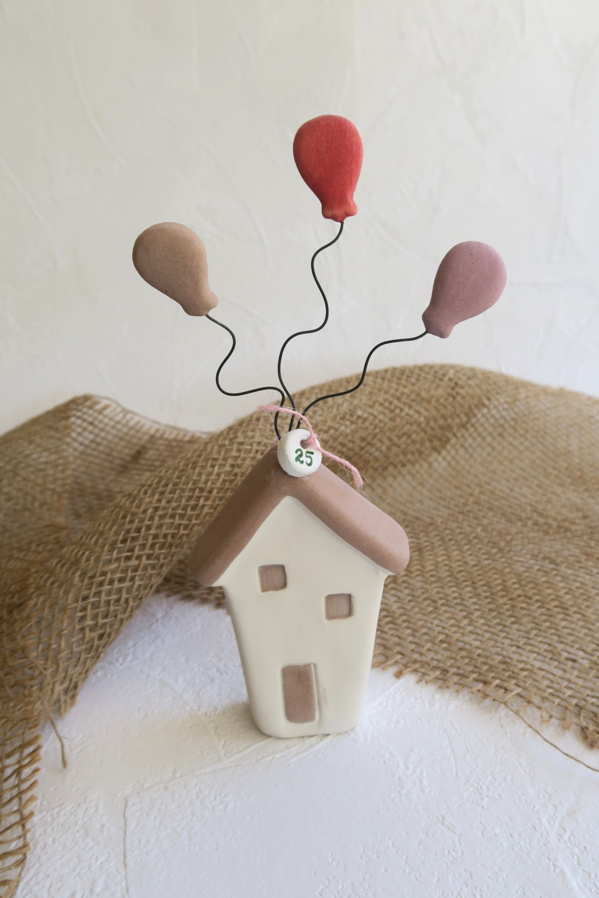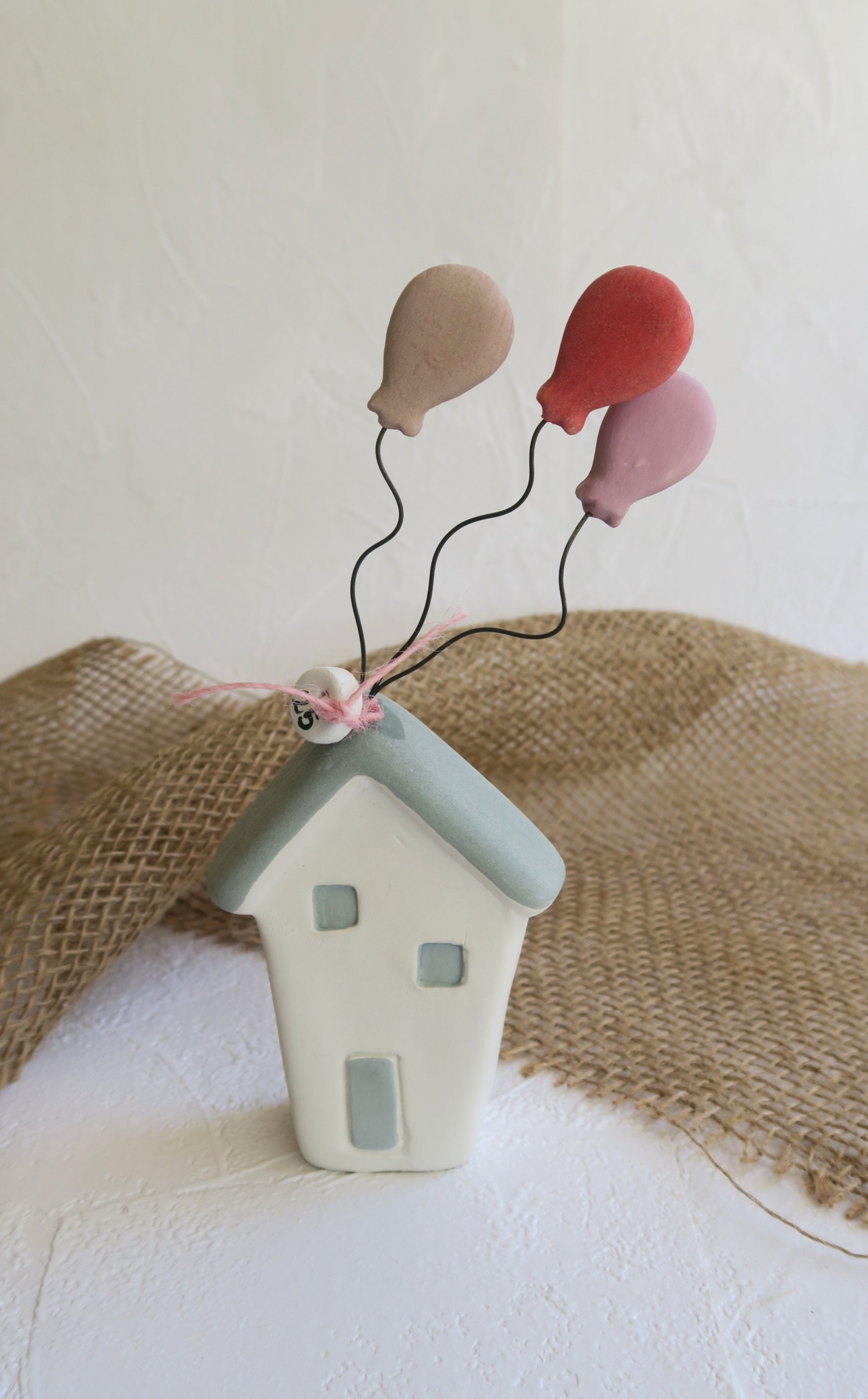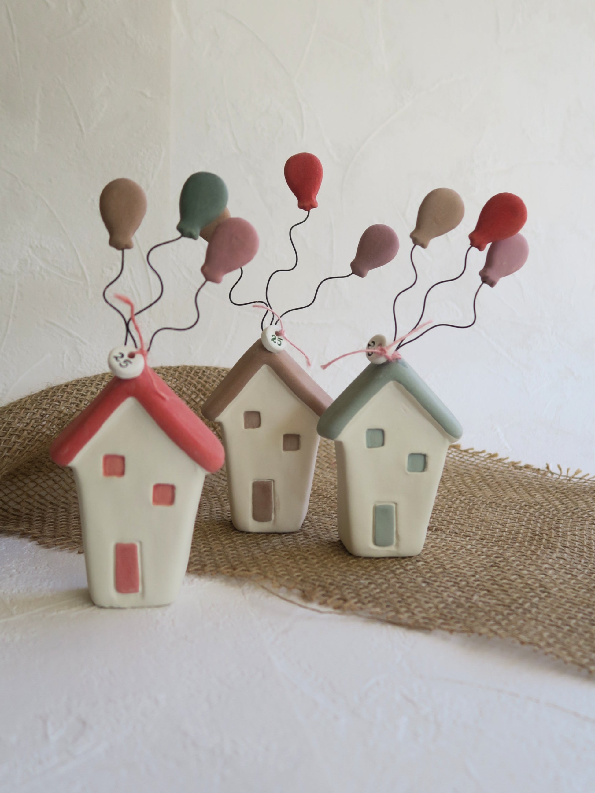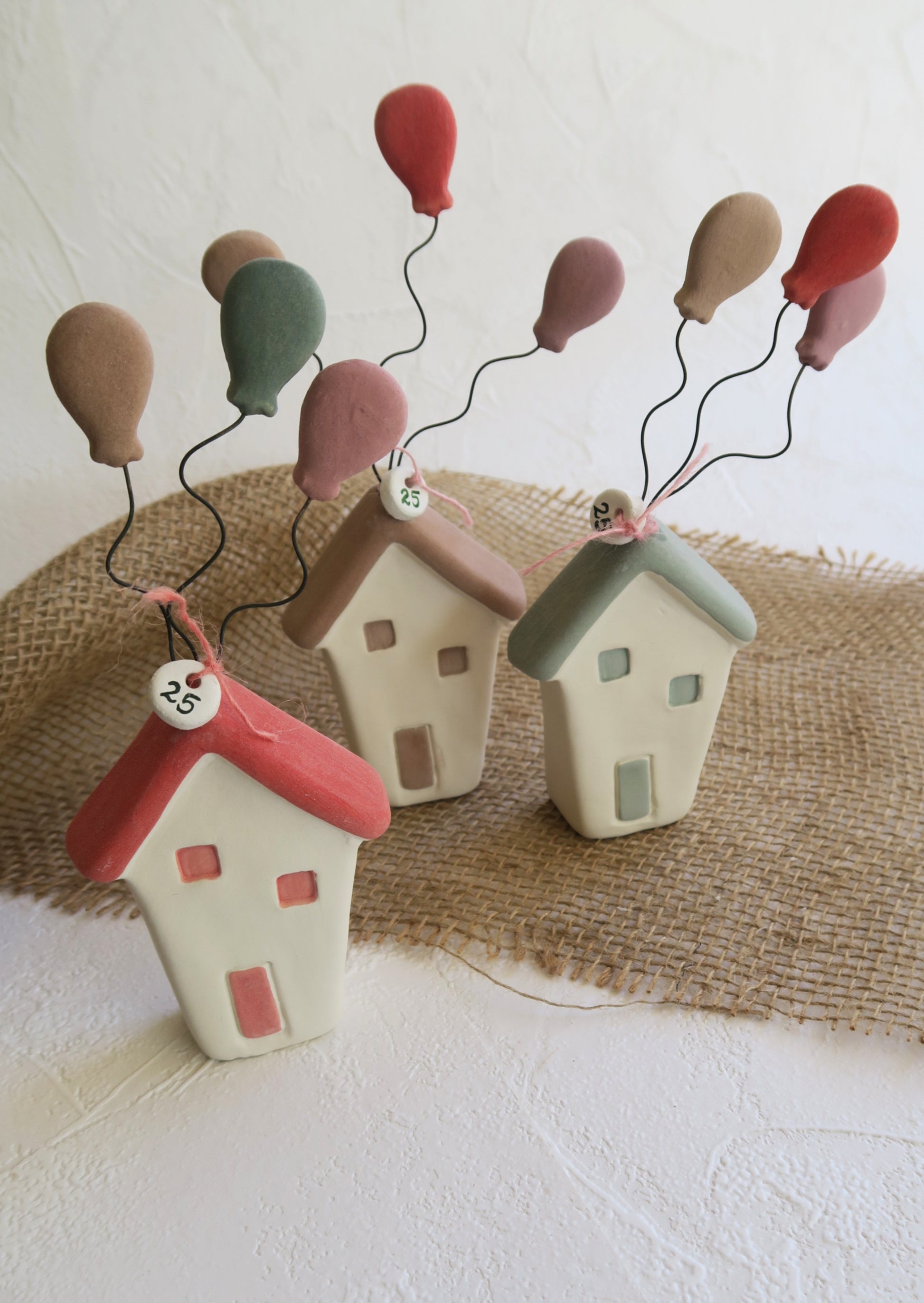 Κεραμικά χειροποίητα σπιτάκια με πολύχρωμα μπαλόνια.