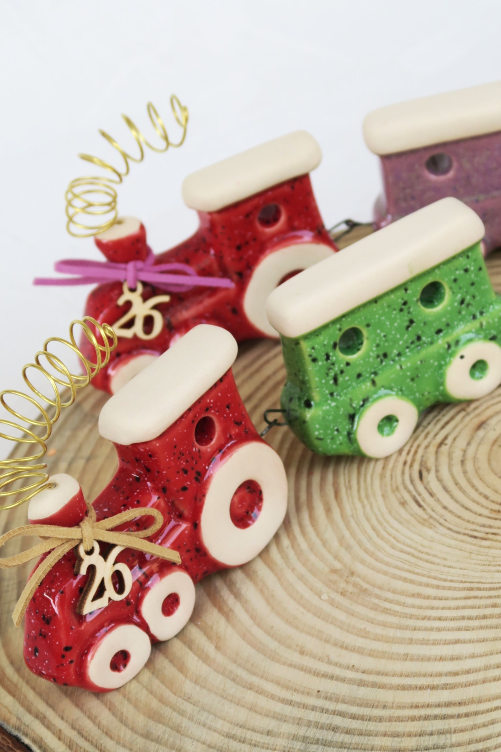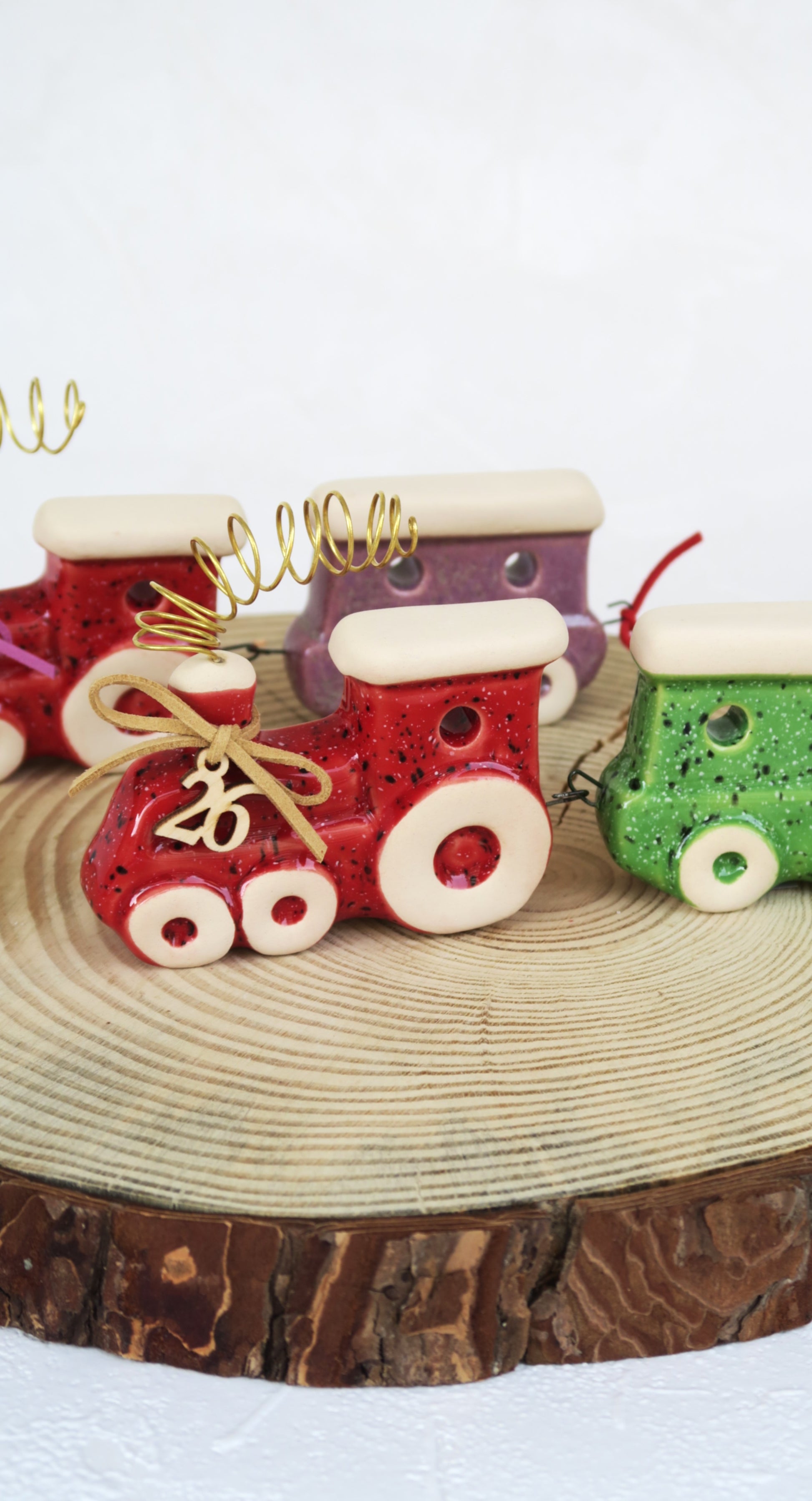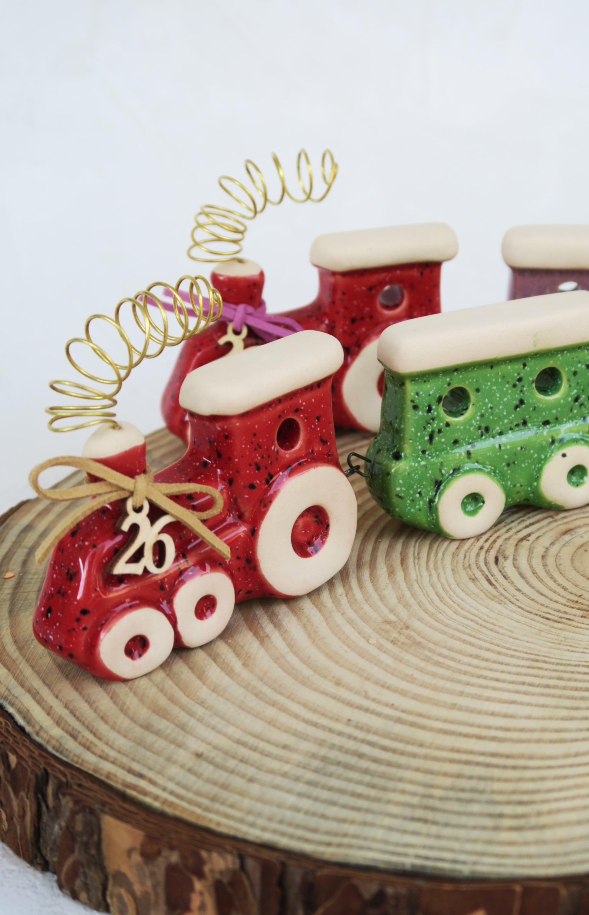Κεραμικά χειροποίητα τρενάκια. Αποτελείται από κόκκινη μηχανή και ένα βαγόνι σε δύο χρώματα.
