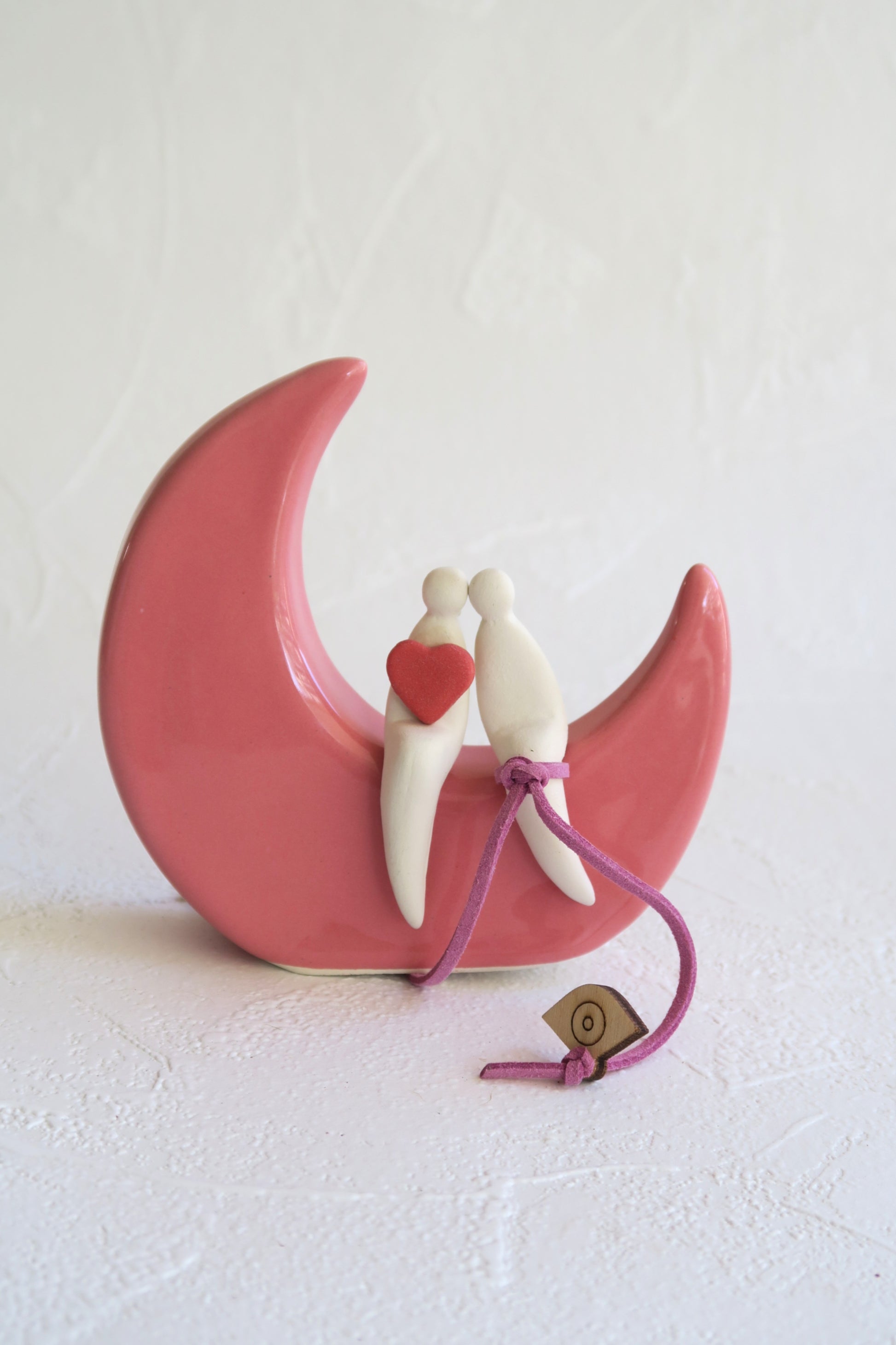 Μικρό κεραμικό φεγγάρι σε ροζ γυαλιστερή απόχρωση με κεραμικο λευκό ζευγάρι.